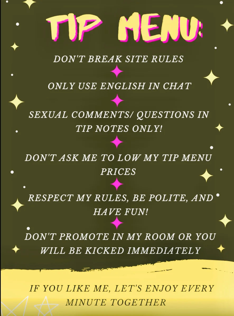 1. Do not spam 2. Create a pleasant atmosphere in the room 3. Tokens first, and then ask what you like 4. if you want to see much more, then take me alone 5. If you liked me, then like and write a comment, I will be very happy 6. Do not make hateful comments